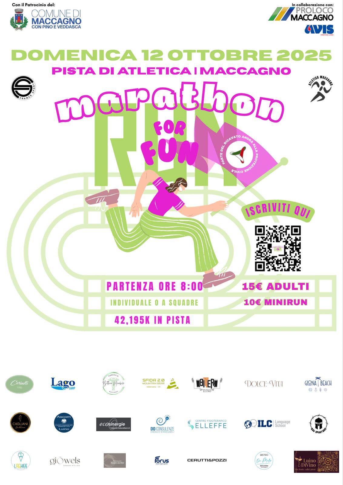 Domenica 12 ottobre 2025 ci troviamo a Maccagno per un evento unico: la Marathon RUNFORFUN, non competitiva, inclusiva e benefica.