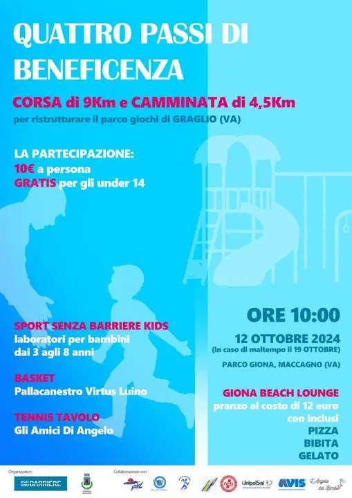 by Pro Loco Eventi 1 Ottobre 2024 Vi aspettiamo SABATO 12 OTTOBRE ORE 10.00 al Parco Giona per ” 4 passi di beneficenza”Unisciti a noi per una giornata di solidarietà!Sport Senza Barriere evento Share: